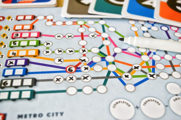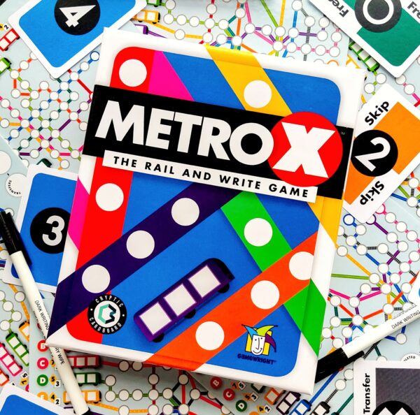 Metro X is a “flip-and-write” game for 1-6 players that takes around 20 minutes to play. It comes with 6 dry-erase boards (and markers) so you never have to worry about running out of paper.